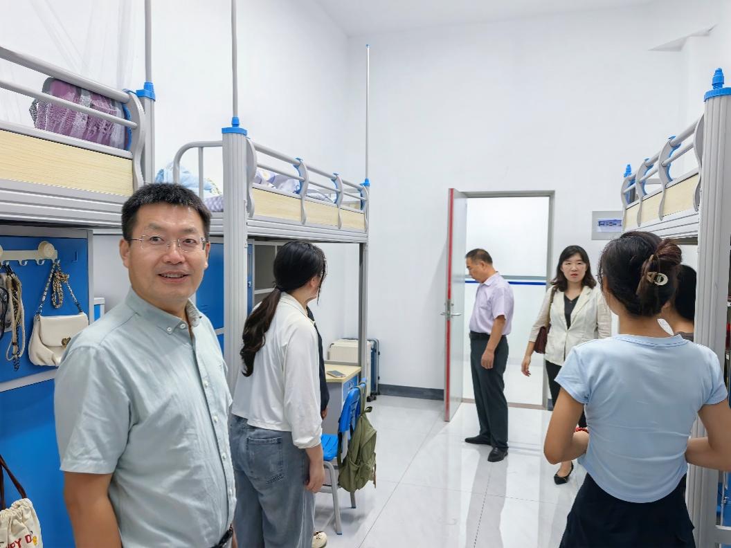 李炳斋一行逐层巡查新生宿舍,重点检查了宿舍内水、电、空调、热水、网络、消防等设施设备的运行状况。走访过程中,与同学们亲切交流,细致询问其生源地、对学校环境的适应情况以及生活上是否存在困难,耐心倾听同学们的反馈与建议。