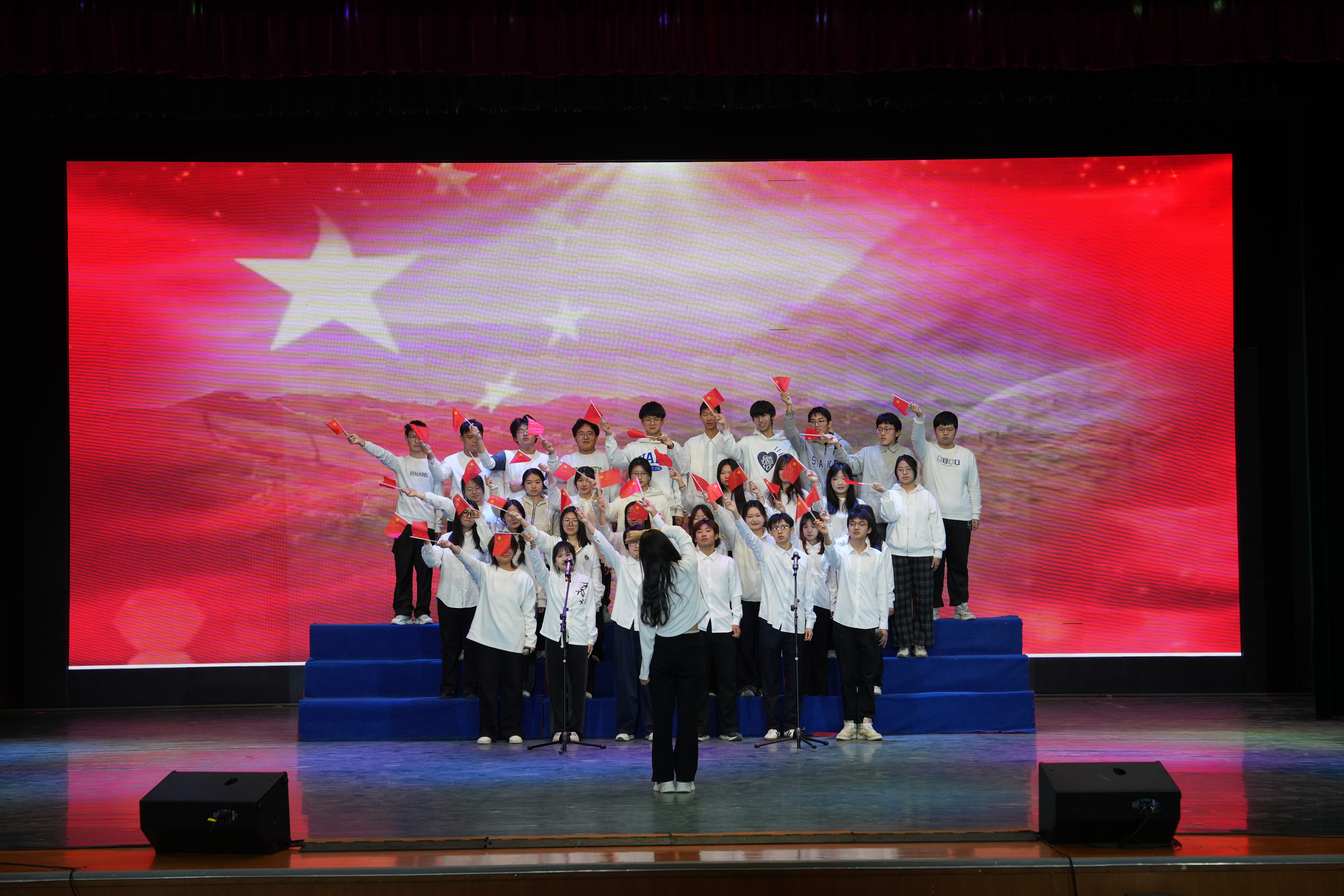 活动伊始,满强老师登台致辞,他勉励全体师生从红歌中汲取青春奋进力量为本次红歌比赛揭开序幕;学生代表刘丰源上台发言,表达了对红色精神的理解以及传承的坚定决心。随后,比赛在小芽艺术团活力洋溢的啦啦操《舞所畏惧》中正式启幕。16 个参赛班级依次登台演唱,以嘹亮歌声诠释红色情怀:既有《强军战歌》的铿锵誓言,又有《紫荆花盛开》的细腻温情;既有《北京欢迎你》的地域情感,又有《我们都是追梦人》的青春誓言……比赛现场气氛热烈,参赛队员歌声嘹亮、情感真挚。