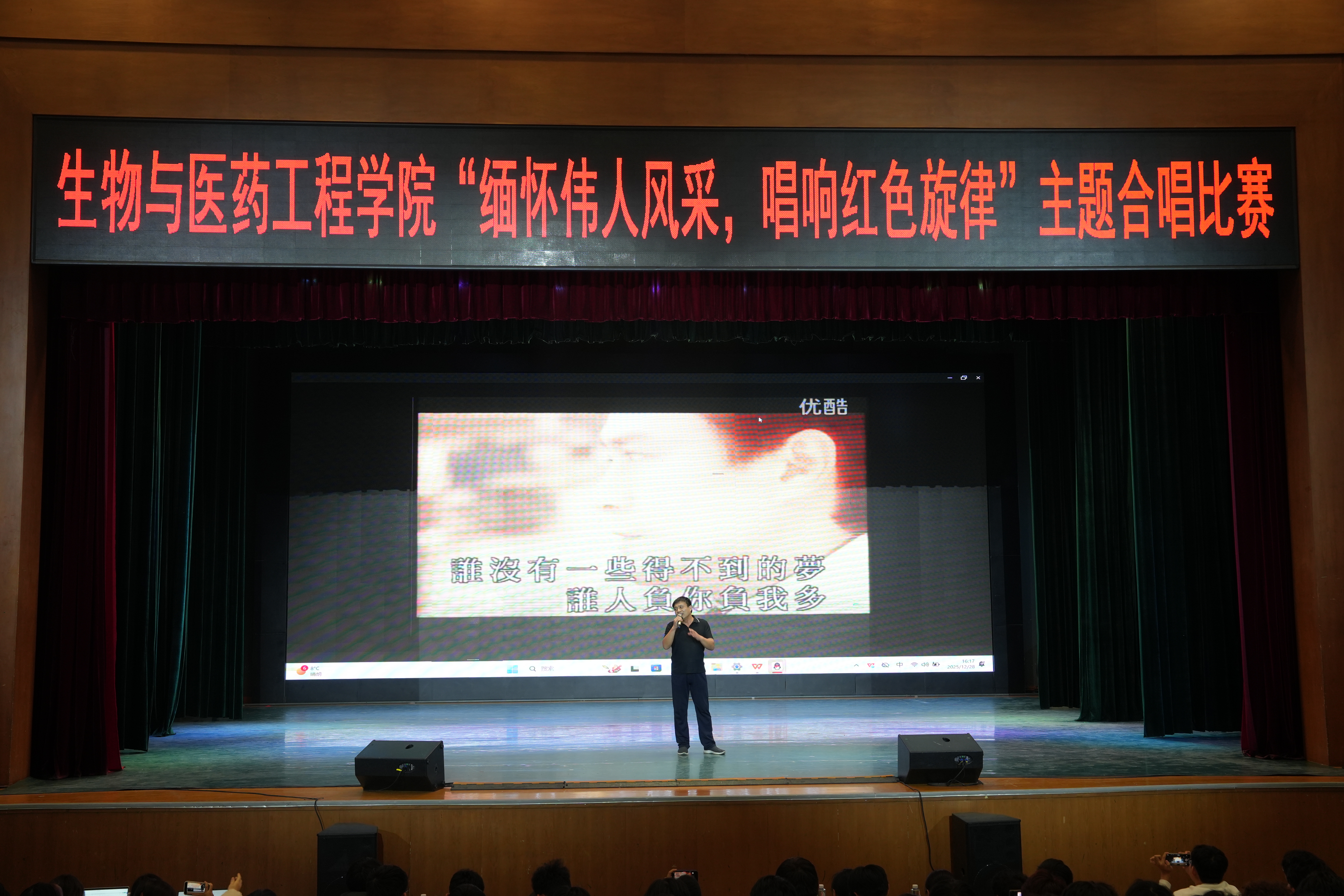 为纪念毛泽东同志诞辰132周年,延续学院红色教育传统,推动“五级网格育人”校园文化建设与思政教育纵深发展,12月28日,qy球友会,千亿球友会于学苑会堂成功举办“缅怀伟人风采,唱响红色旋律”主题合唱比赛。本次活动特邀研究生处副处长刘俊华,qy球友会党委副书记时芸,辅导员满强、周建芳、陈新宇及学生会主席团担任评委,23、24、25 级全体学生共同参与。